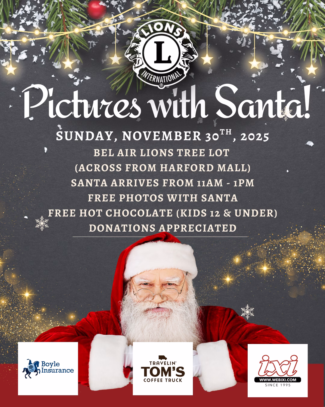 The Bel Air Lions Club Christmas Tree Lot is our largest fundraiser of the year, with more than 950 trees sold annually on bustling Route 24 across from the Harford Mall. This year, we’re expanding with exciting sponsorship opportunities and a special Santa Day—where families can take pictures with Santa on the lot.